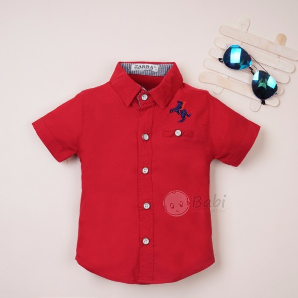 Tên sản phẩm Sơ mi trơn tay ngắn thêu hình ngựa cổ phối caro cho bé trai